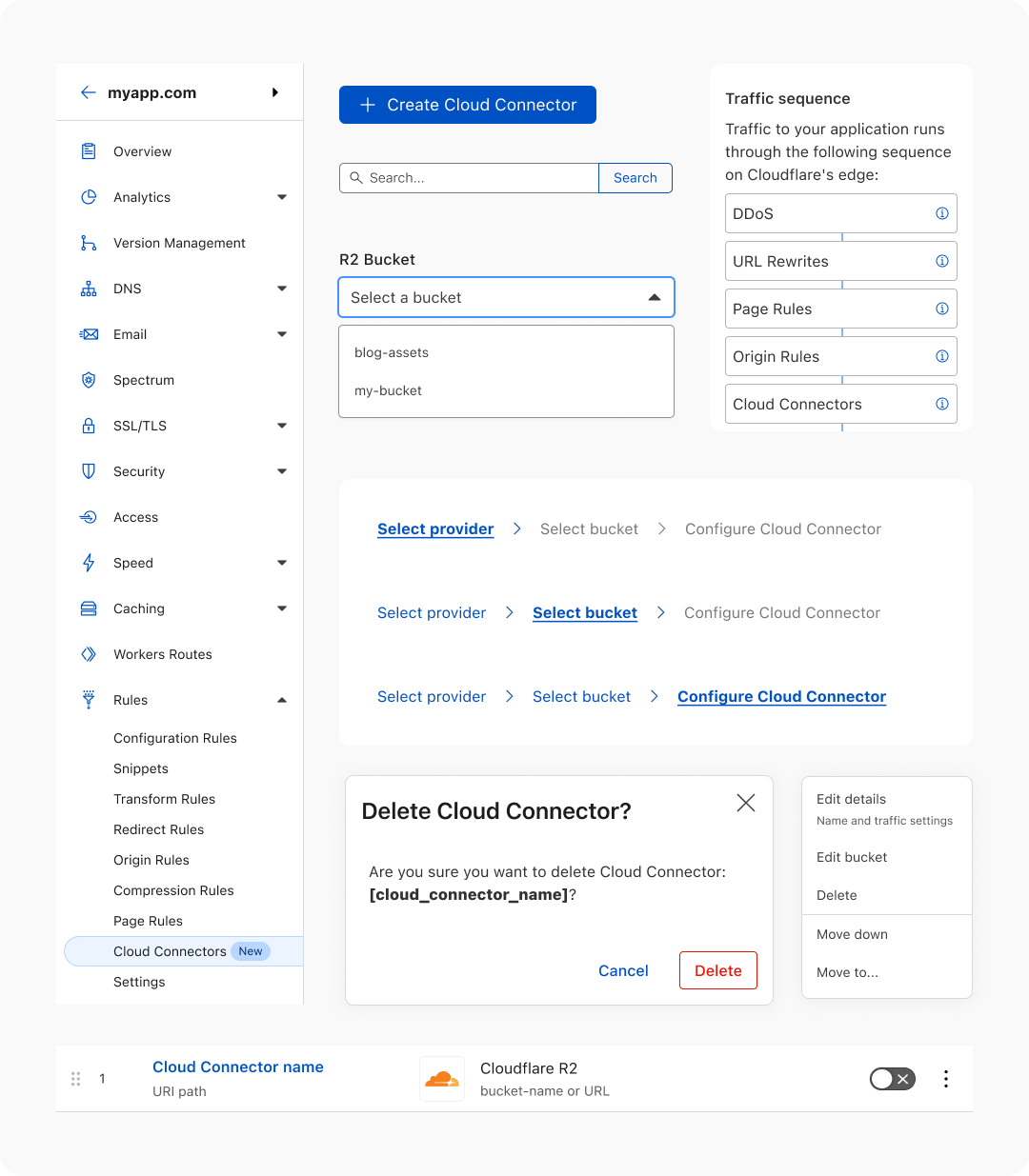 With the user stories as my map, I created a series of wireframes covering the most important screens. Due to how highly interlinked the features of Cloudflare are, it quickly became clear that the hardest part of this project would be identifying all the edge cases and creating solutions to those micro problems.