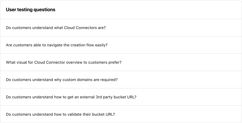 Worked with a researcher to agree on the questions that would be posed to candidates as they navigate through test. Due to the required technical knowledge to understand the use case of this new feature, it was decided to utilize the Cloudflare audience to test the usability of Cloud Connector.